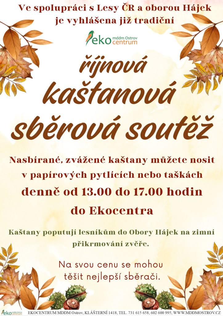 denně od 13.00 do 17.00 hodin do Ekocentra. Zapisuje se váha přinesených kaštanů, nosit můžete opakovaně.
